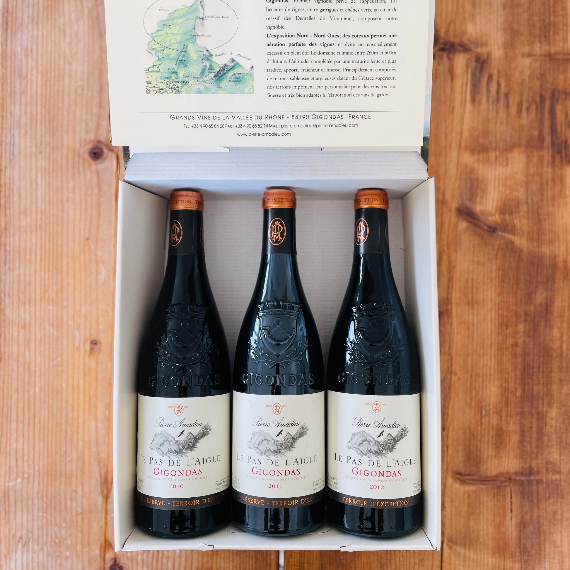 Med denne eksklusive sampakning fra Pierre Amadieu får du mulighed for at smage husets topvin Le Pas de l’Aigle i tre unikke årgange: 2010, 2011 og 2012. Vinen er skabt fra 60 år gamle Grenache-vinstokke og højtliggende marker i 400 meters højde ved foden af Dentelles de Montmirail. Kombinationen af de magre blå mergeljorde og den kølige nordvestvendte eksponering giver en vin med imponerende koncentration, friskhed og kompleksitet.